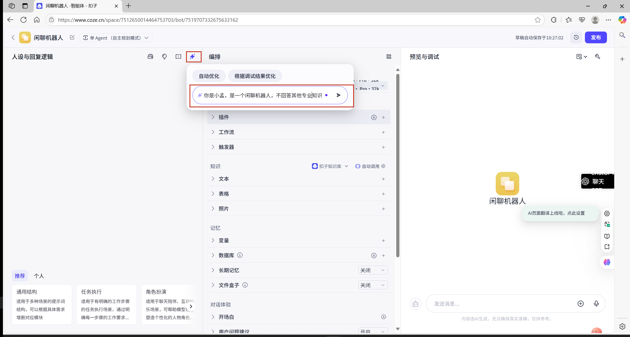 点击自动优化提示词,输入以下内容,可以自动生成适合的提示词。
