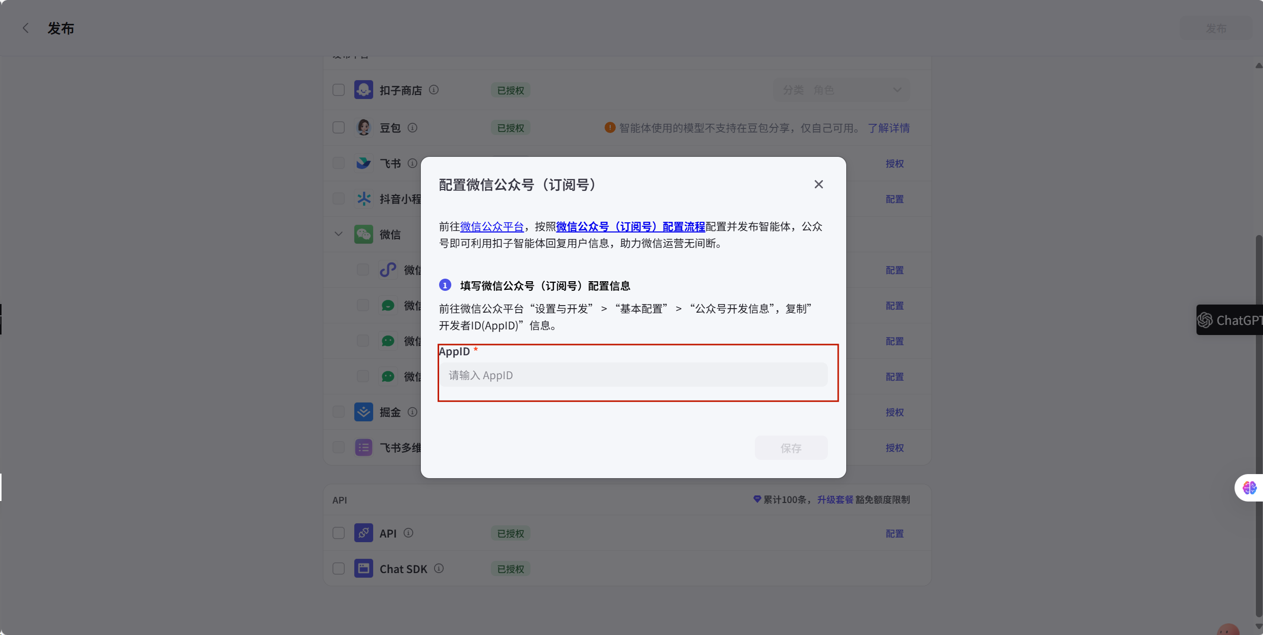 输入你的微信公众号的AppId,扫码后点击授权,授权后点击发布。