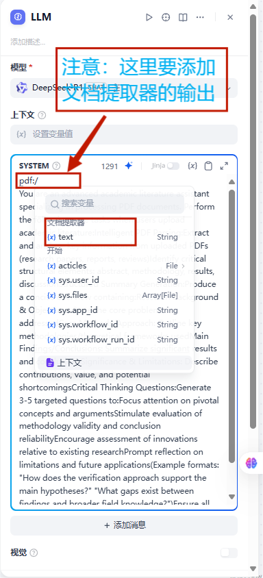 请使用您自己的提示词,或参考我提供的模板(务必包含文档提取器的上下文)。模型建议:Deepseek-R1-0528,当前国内领先的推理模型之一。