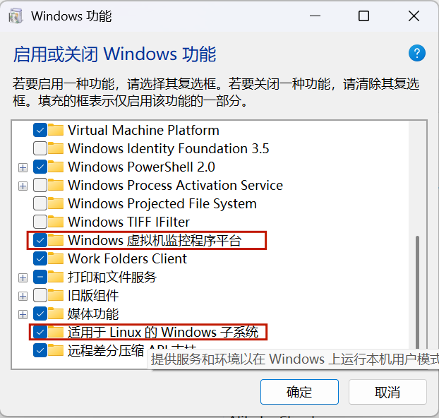 勾选Windows虚拟机监控程序平台和适用于Linux的Windows子系统