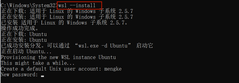 在管理员模式下打开Windows命令提示符,输入wsl --install