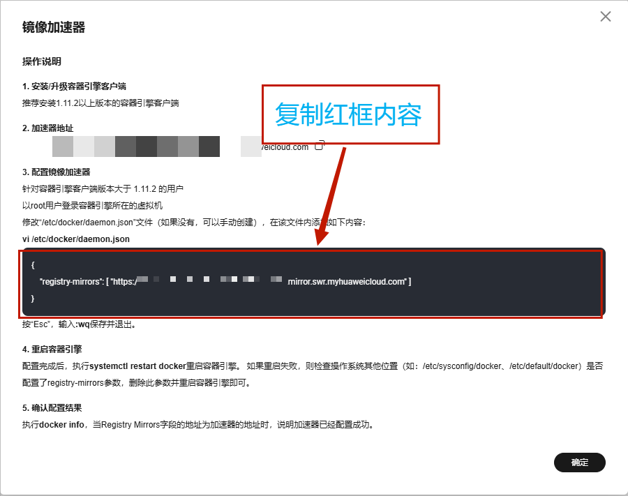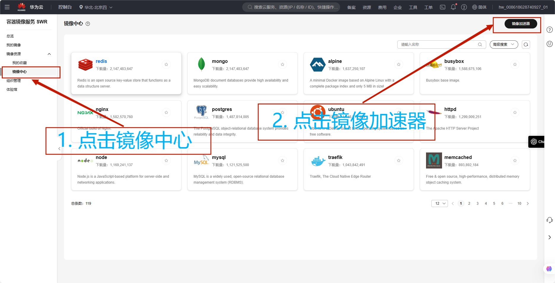 进入华为容器镜像服务控制台,点击镜像中心->镜像加速器
