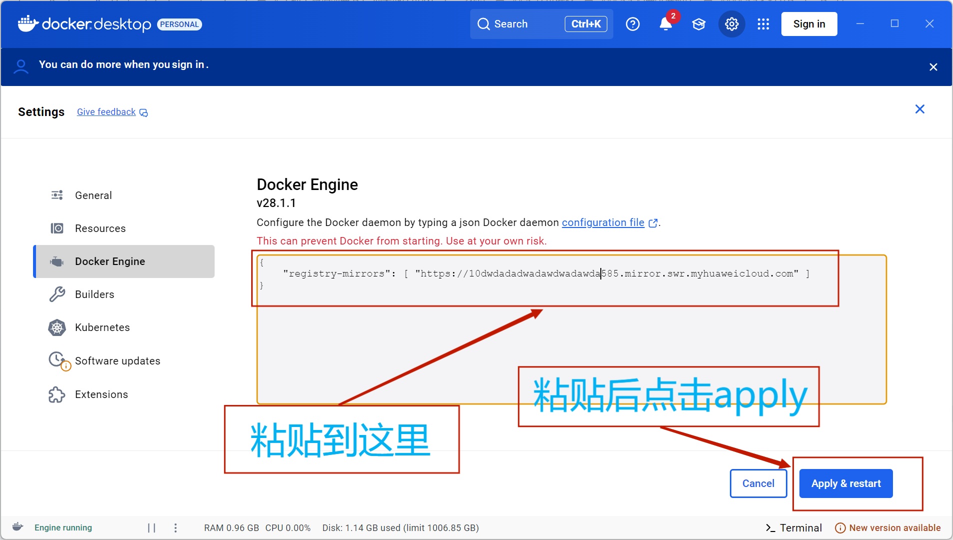 打开docker Desktop,点击设置->Docker Engine,将复制的内容粘贴到下图的红框中,点击Apply & restart。