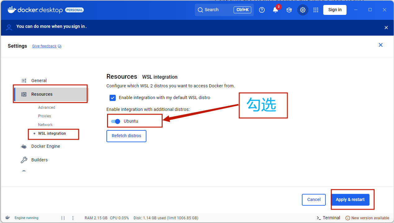 进入设置->Resources->WSL integration,勾选Ubuntu,点击Apply & restart。