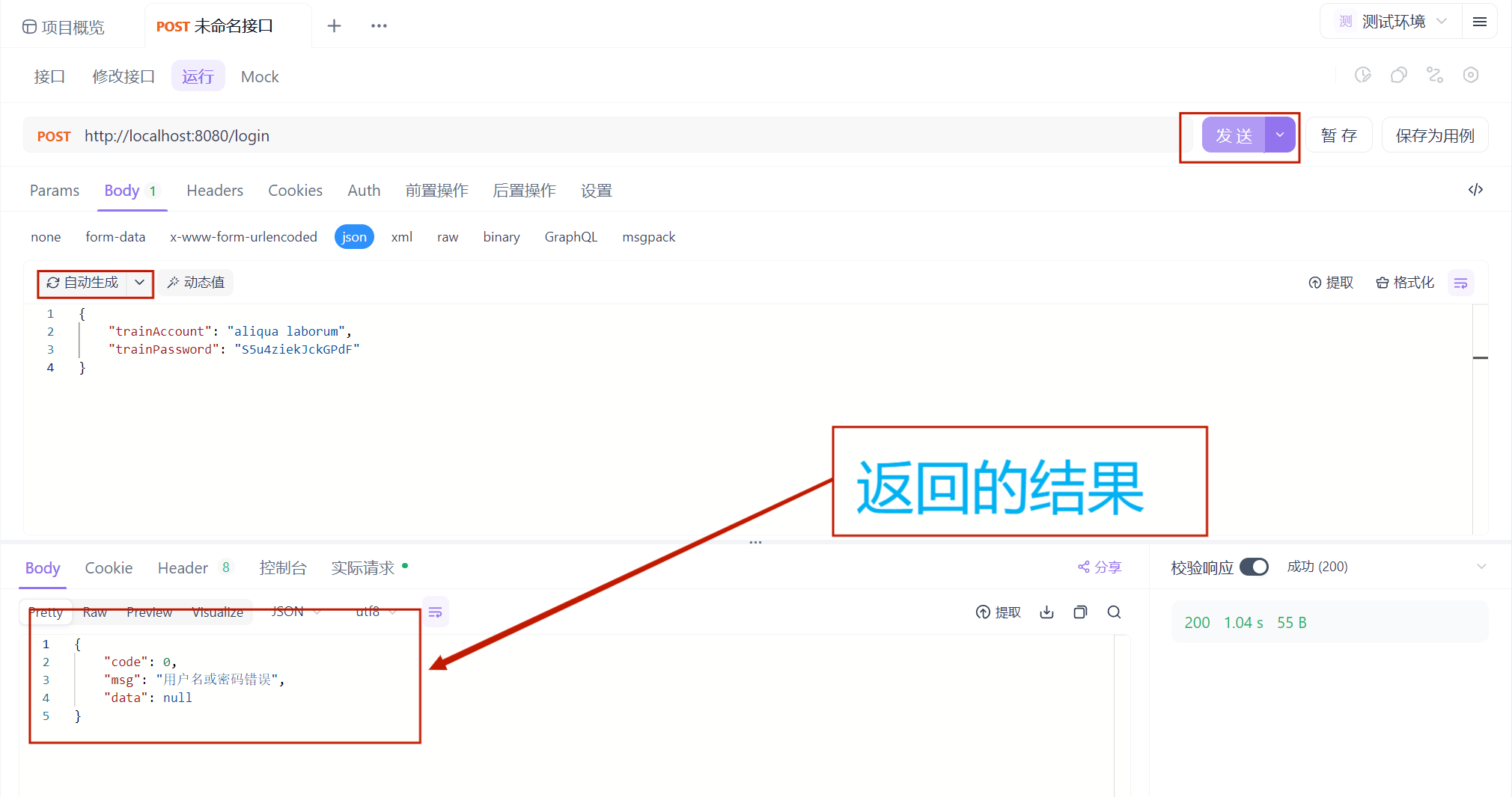 点击自动生成,生成一个测试示例,点击发送,查看接口的响应结果。如果可以返回以下结果,则说明接口开发成功。